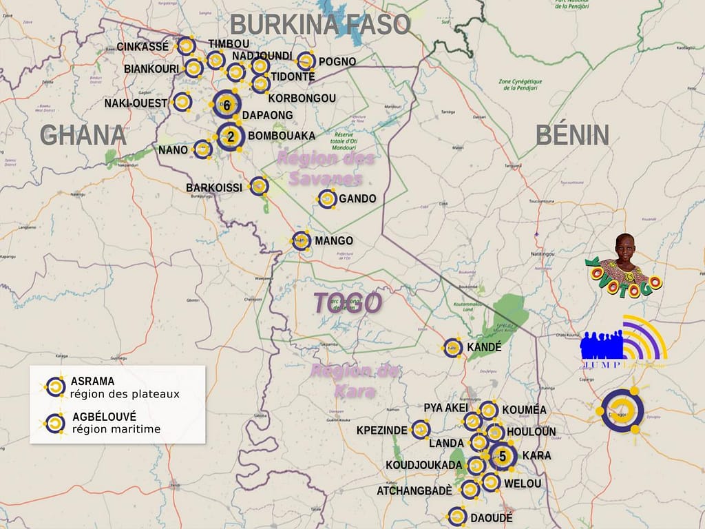 - Actions : Installation de 37 salles de 20 ordinateurs (soit 1320 ordinateurs) dans des structures éducatives/sociales au nord Togo depuis 2015, avec maintenance réalisée par JUMP Lab’ partenaire local.