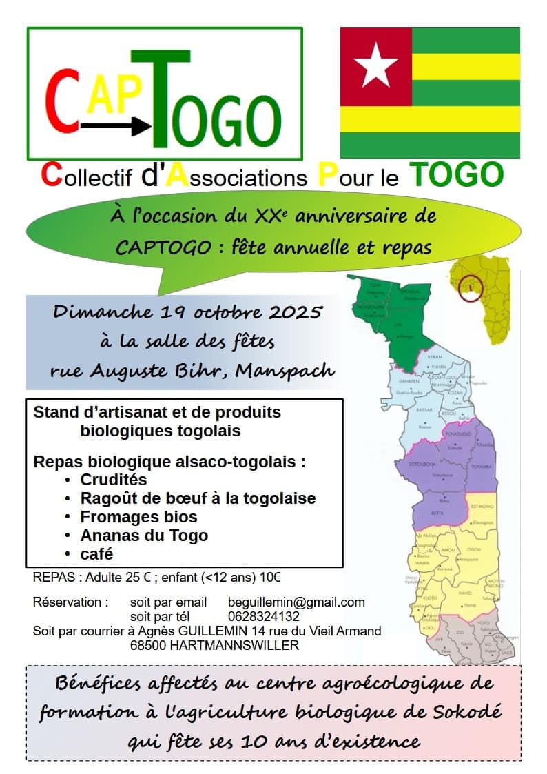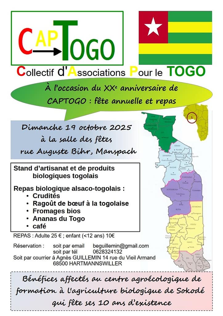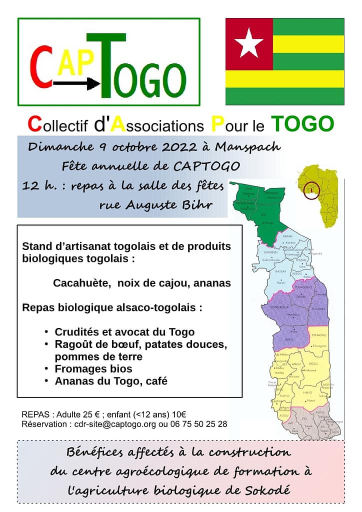 Notre fête annuelle 2022, avec son point d’orgue le repas alsaco-togolais, aura lieu dans la salle des fêtes de Manspach, dimanche 9 octobre à partir de 12 heures.