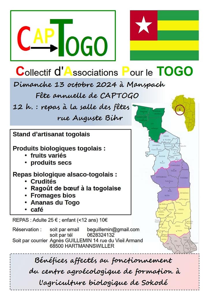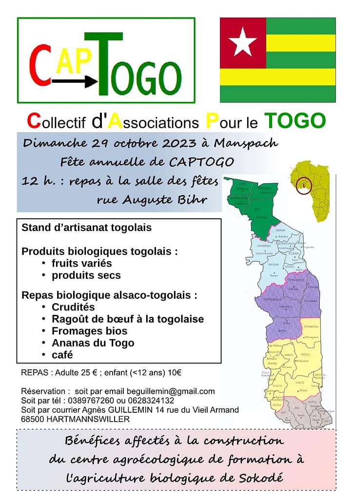 Notre fête annuelle 2023, avec son point d’orgue le repas alsaco-togolais, aura lieu dans la salle des fêtes de Manspach, dimanche 29 octobre à partir de 12 heures.